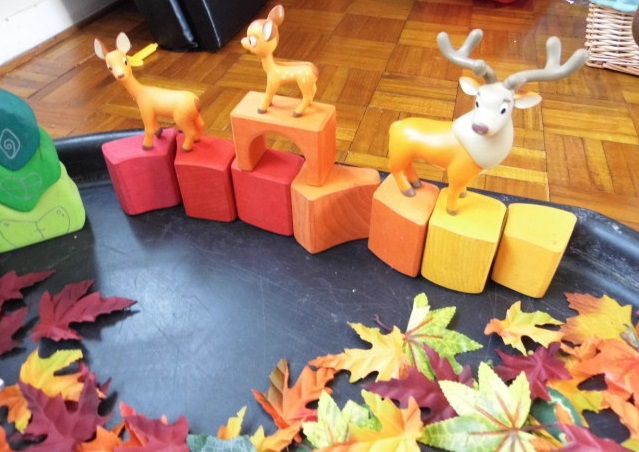 We then set up our tuff spot with all our Autumn leaves, selection of conkers and all the animals from the stories we have been reading, they built some houses and spent time making the animals stomp and jump through the leaves.