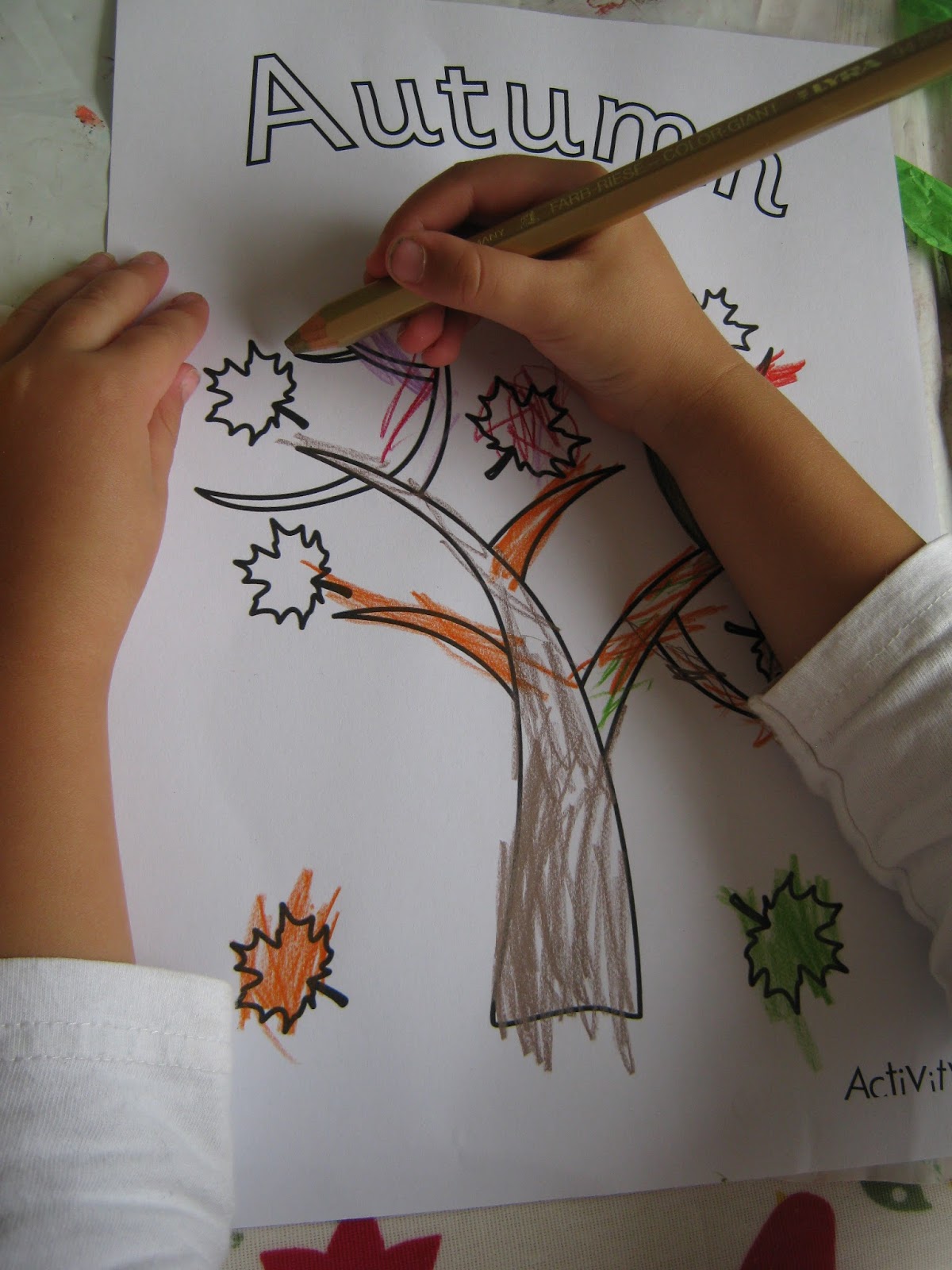autumn tree printable for them to use with tissue paper and various stickers I had. We talked about the different colours they might see at this time of year and they chose the colours to match.